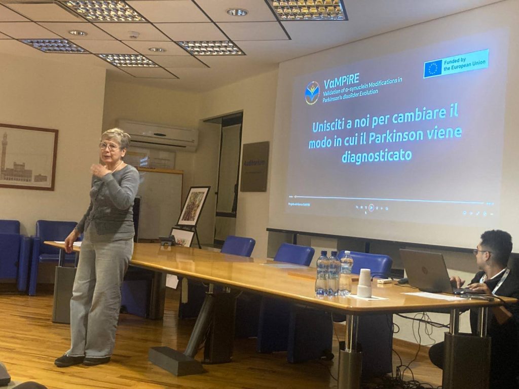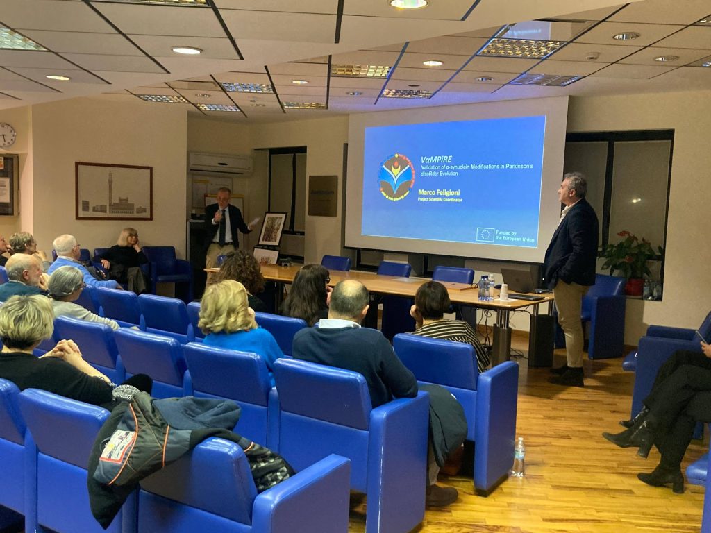 The scientific program continued with Dr. Marco Feligioni, who presented VaMPiRE, a joint research project investigating α-synuclein proteins and the consequences of their misfolding. He also introduced the consortium of leading European institutes and research centers involved in the project. Dr. Elda Judica followed with a discussion on the clinical implications of VaMPiRE and emphasized the importance of patient participation in research.